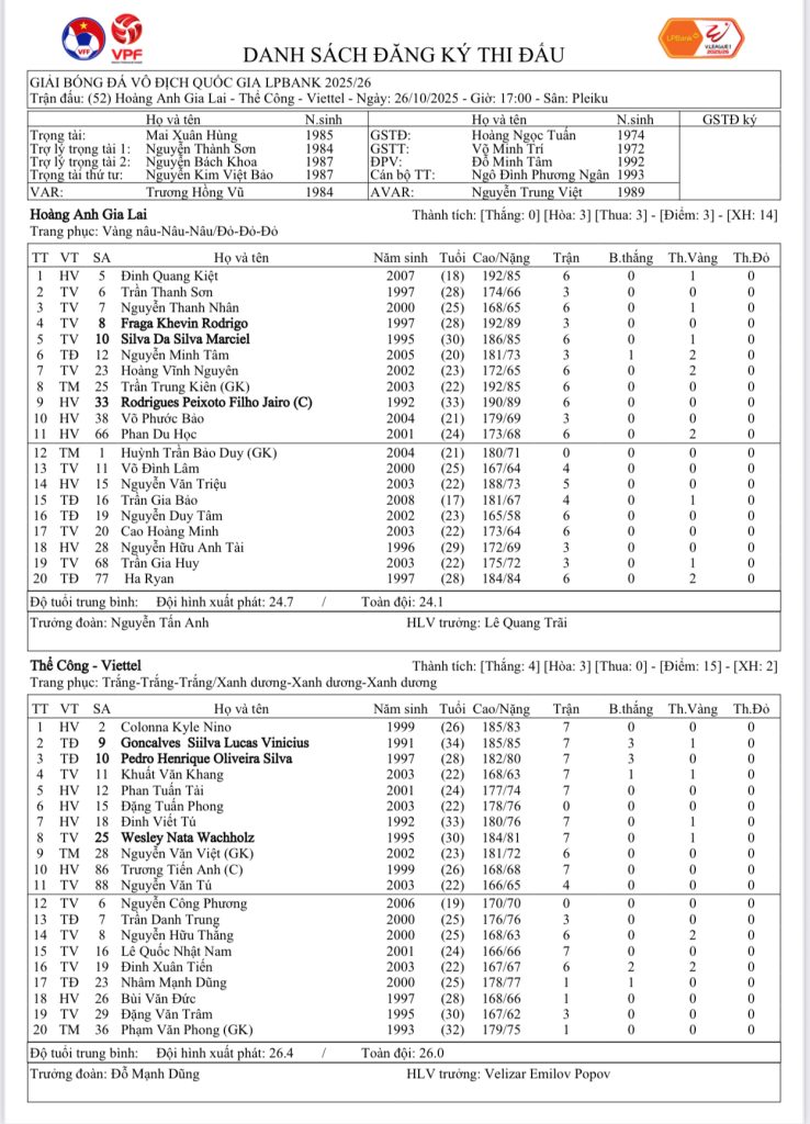 Danh sách đăng ký thi đấu CLB HAGL vs CLB Thể Công Viettel (vòng 8 Giải VĐQG LPBank 2025/26)