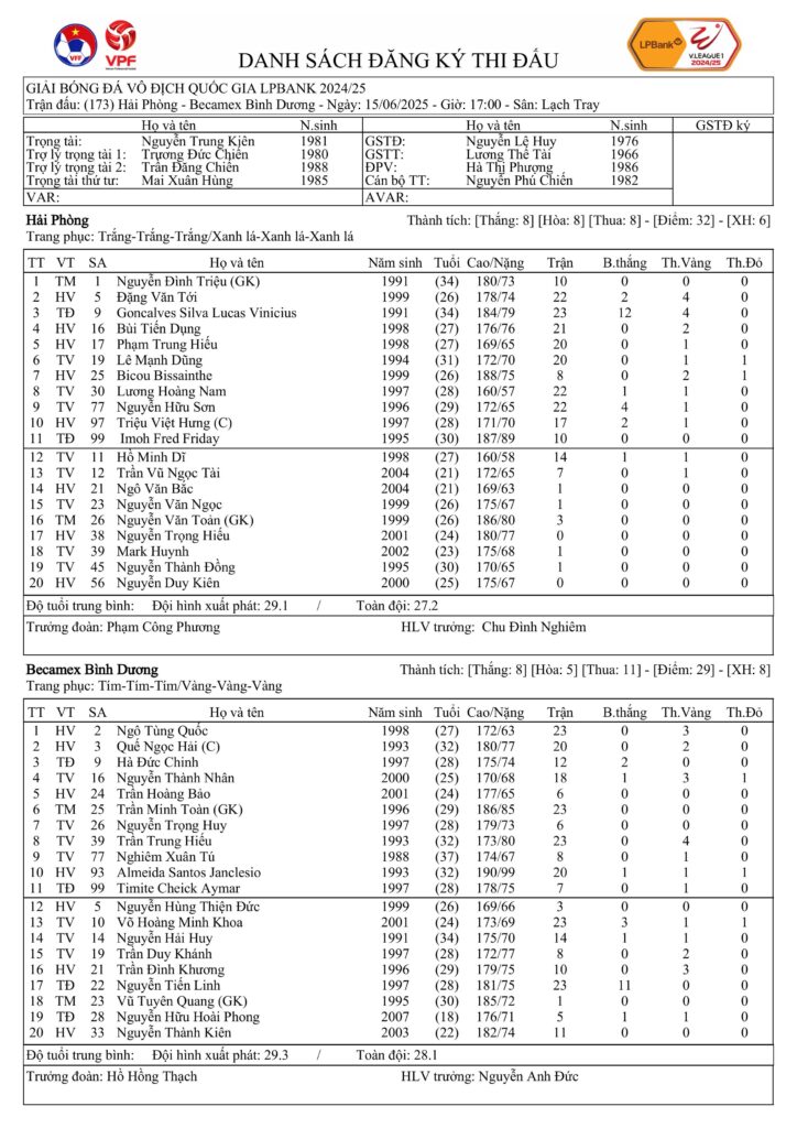 Danh sách đăng ký thi đấu CLB Hải Phòng vs CLB Becamex Bình Dương (vòng 25 VĐQG LPBank 2024/25)