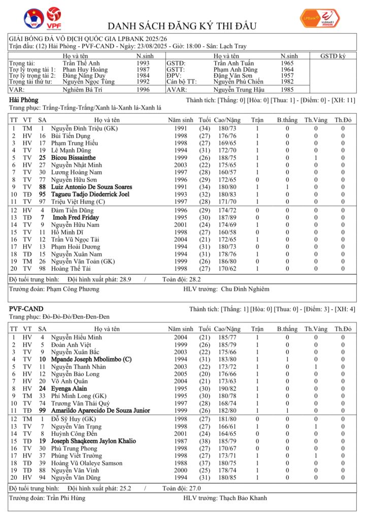 Danh sách đăng ký thi đấu CLB Hải Phòng vs CLB PVFCAND (vòng 2 LPBank V.League 1-2025/26)