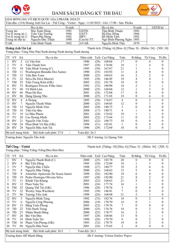Danh sách đăng ký thi đấu CLB Hoàng Anh Gia Lai vs CLB Thể Công Viettel (vòng 22 VĐQG LPBank 2024/25)