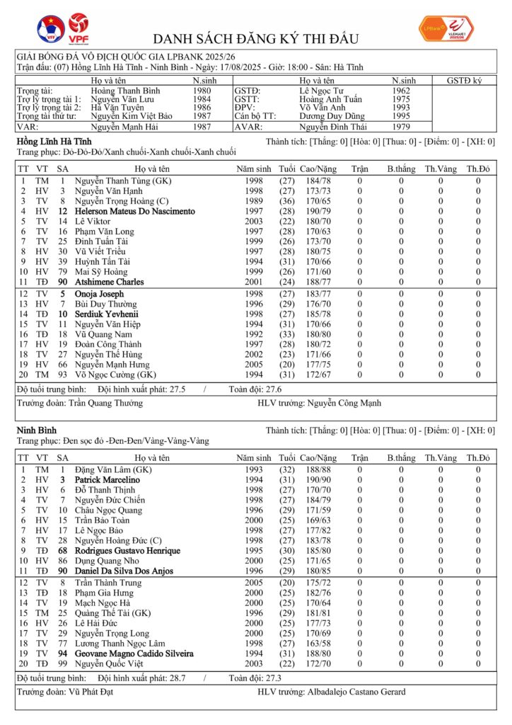 Danh sách đăng ký thi đấu CLB Hồng Lĩnh Hà Tĩnh vs CLB Ninh Bình (vòng 1 VĐQG LPBank 2025/26)