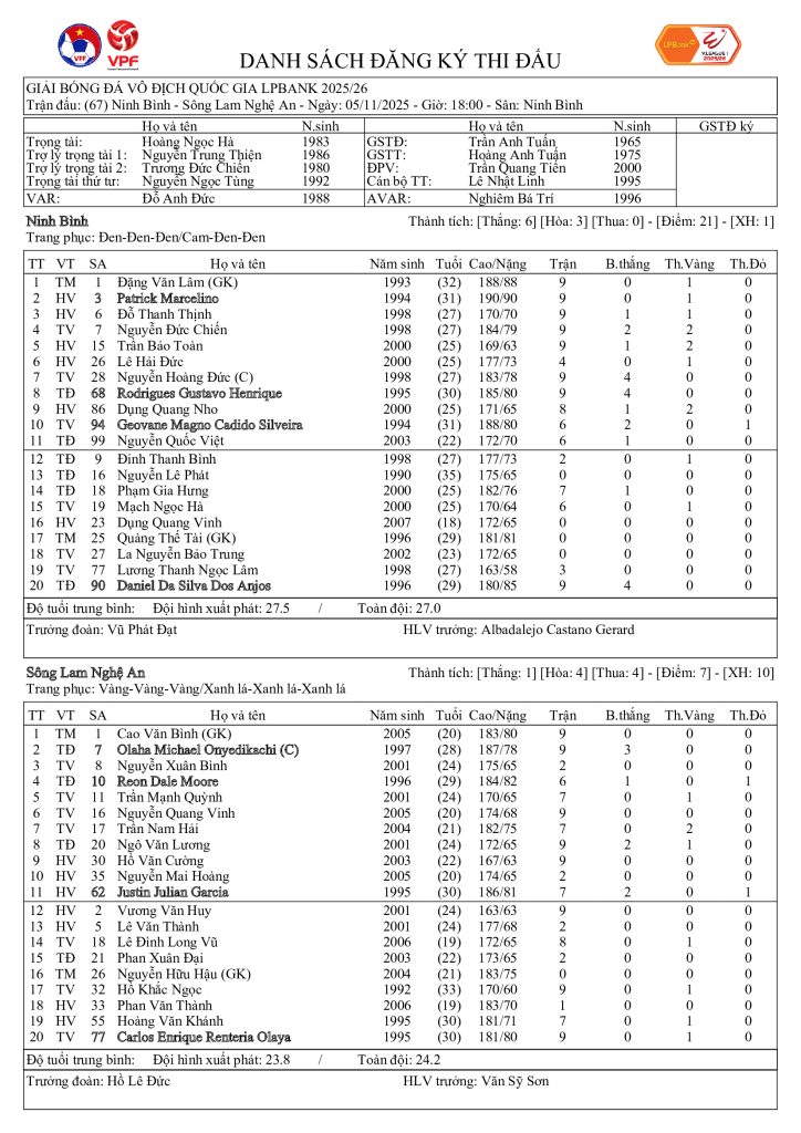 Danh sách đăng ký thi đấu CLB Ninh Bình vs CLB Sông Lam Nghệ An (vòng 10 VĐQG LPBank 2025/26)