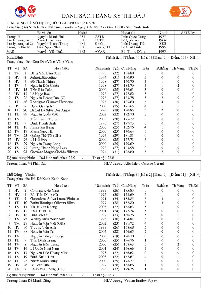 Danh sách đăng ký thi đấu CLB Ninh Bình vs CLB Thể Công Viettel (vòng 6 VĐQG LPBank 2025/26)