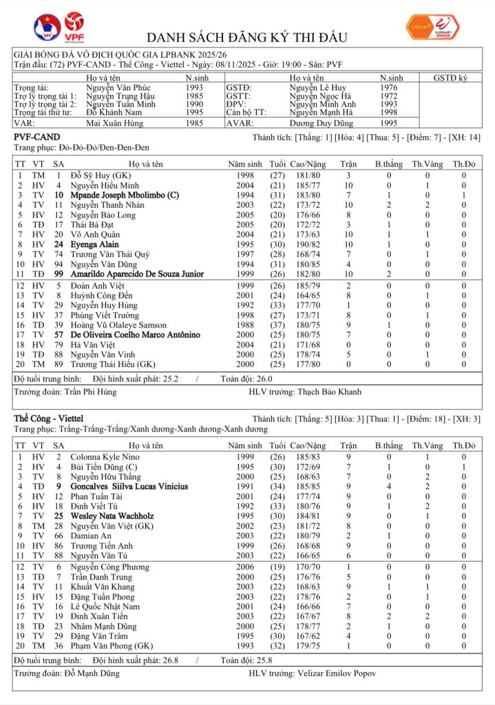 Danh sách đăng ký thi đấu CLB PVF CAND vs CLB Thể Công Viettel (vòng 11 VĐQG LPBank 2025/26)