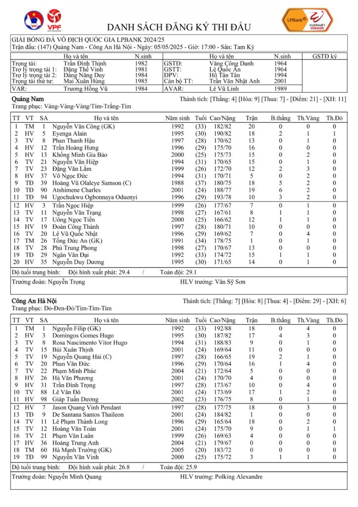 Danh sách đăng ký thi đấu CLB Quảng Nam vs CLB Công An Hà Nội (vòng 21 VĐQG LPBank 2024/25)