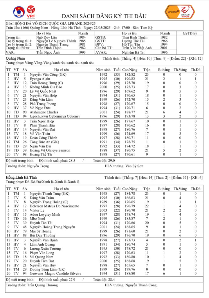 Danh sách đăng ký thi đấu CLB Quảng Nam vs CLB Hồng Lĩnh Hà Tĩnh (vòng 24 LPBank V.League 1-2024/25)