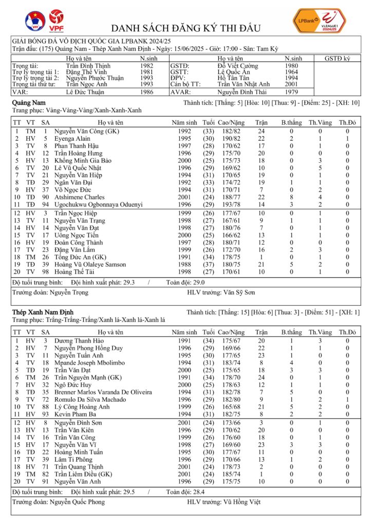 Danh sách đăng ký thi đấu CLB Quảng Nam vs CLB Thép Xanh Nam Định (vòng 25 VĐQG LPBank 2024/25)