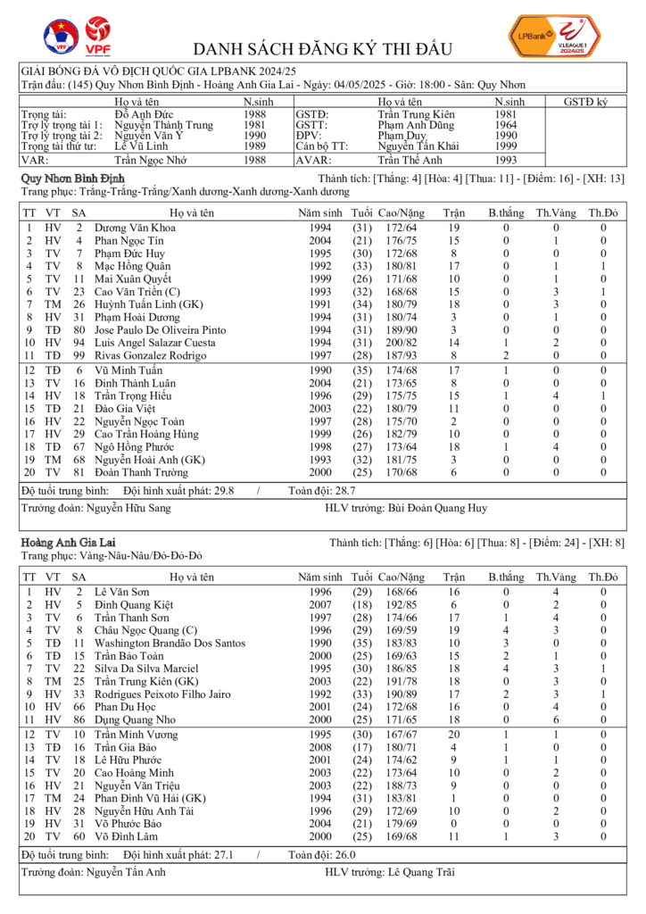 Danh sách đăng ký thi đấu CLB Quy Nhơn Bình Định vs CLB Hoàng Anh Gia Lai (vòng 21 VĐQG LPBank 2024/25)