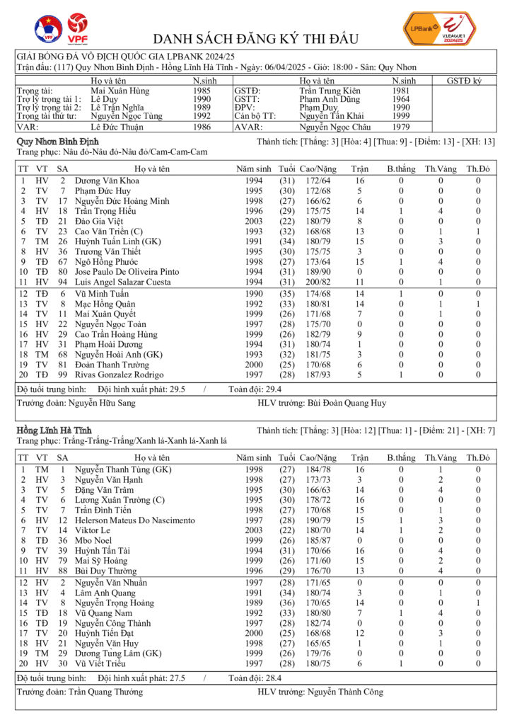 Danh sách đăng ký thi đấu CLB Quy Nhơn Bình Định vs CLB Hồng Lĩnh Hà Tĩnh (vòng 17 LPBank V.League 2024/25)