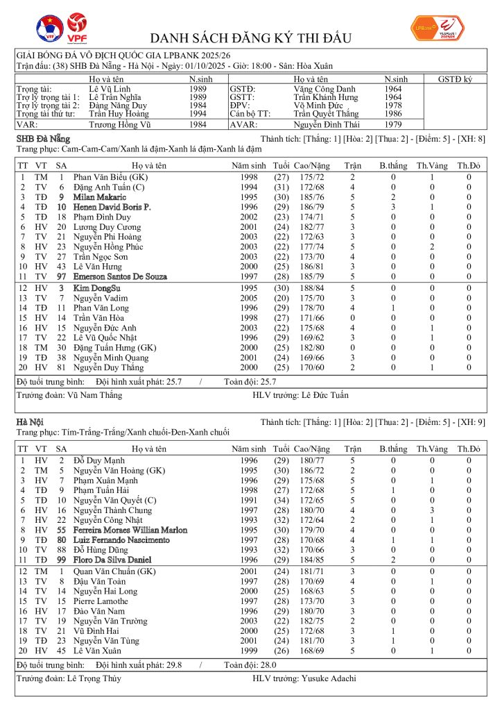 Danh sách đăng ký thi đấu CLB SHB Đà Nẵng vs CLB Hà Nội (vòng 6 VĐQG LPBank 2025/26)