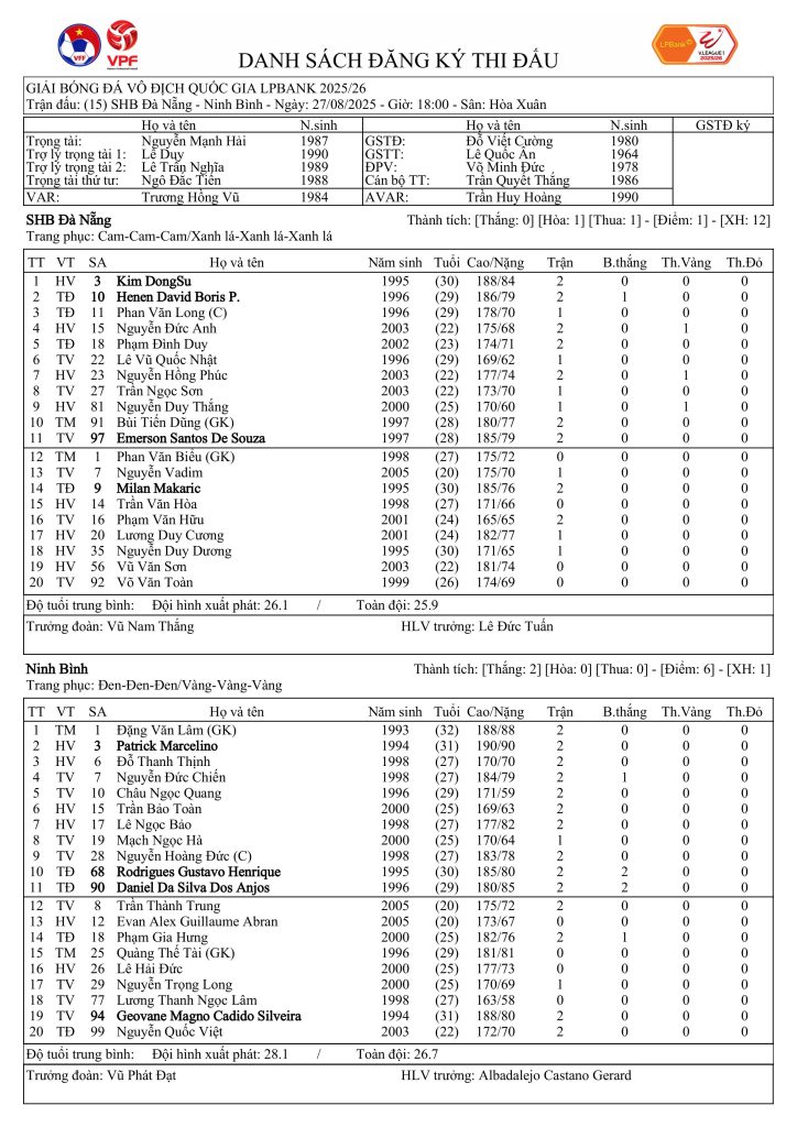 Danh sách đăng ký thi đấu CLB SHB Đà Nẵng vs CLB Ninh Bình (vòng 3 VĐQG LPBank 2025/26)
