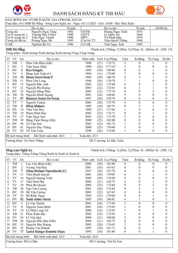 Danh sách đăng ký thi đấu CLB SHB Đà Nẵng vs CLB Sông Lam Nghệ An (vòng 9 VĐQG LPBank 2025/26)