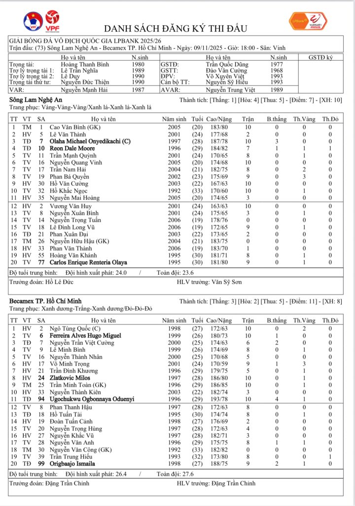 Danh sách đăng ký thi đấu CLB Sông Lam Nghệ An vs CLB Becamex TP.HCM (vòng 11 Giải VĐQG LPBank 2025/26)
