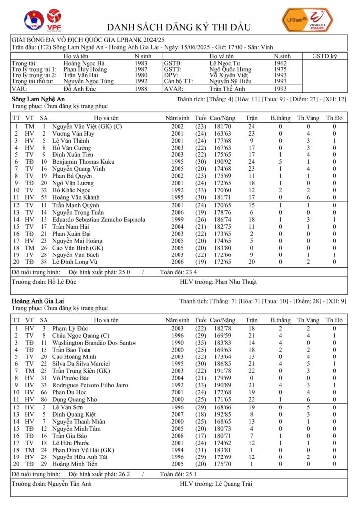 Danh sách đăng ký thi đấu CLB Sông Lam Nghệ An vs CLB Hoàng Anh Gia Lai (vòng 25 VĐQG LPBank 2024/25)