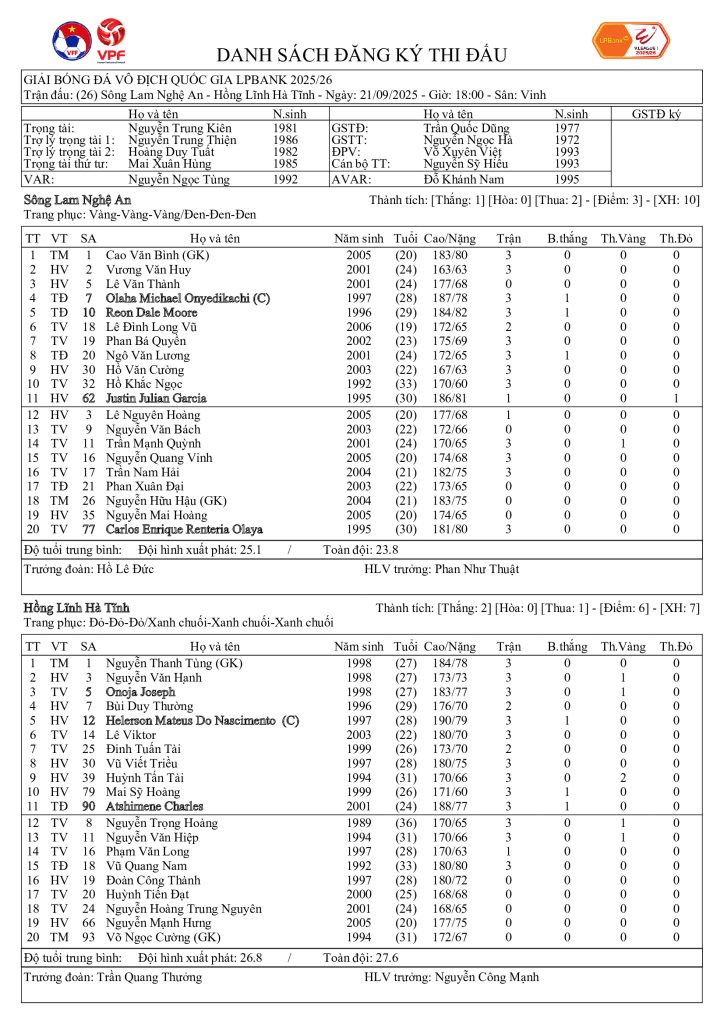 Danh sách đăng ký thi đấu CLB Sông Lam Nghệ An vs CLB Hồng Lĩnh Hà Tĩnh (vòng 4 VĐQG LPBank 2025/26)