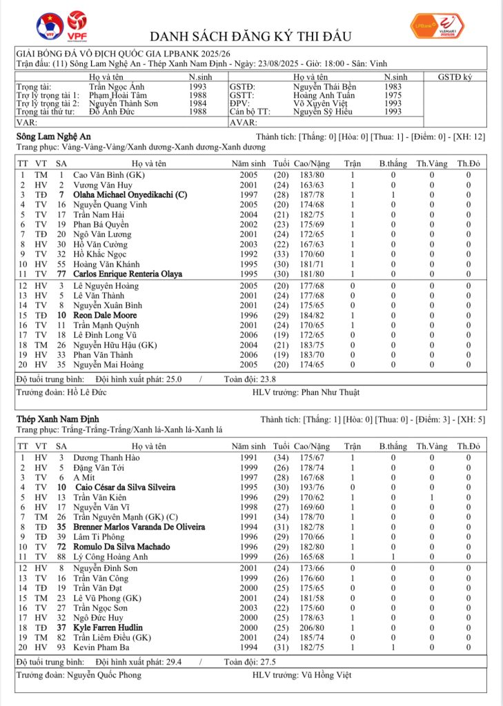 Danh sách đăng ký thi đấu CLB Sông Lam Nghệ An vs CLB Thép Xanh Nam Định (vòng 2 LPBank V.League 1-2025/26)