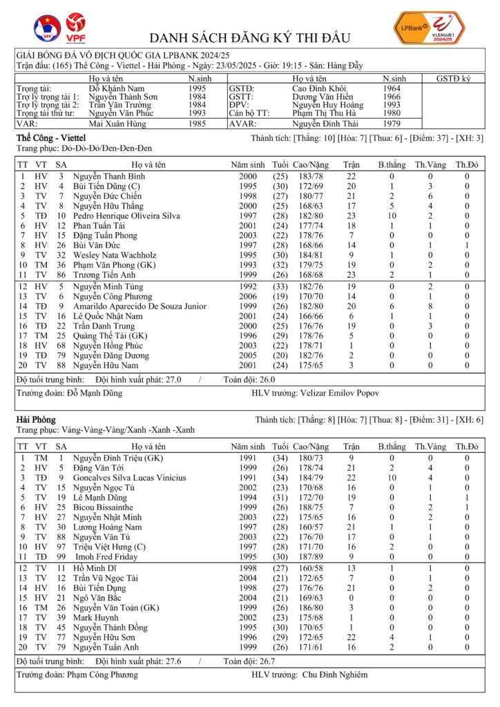Danh sách đăng ký thi đấu CLB Thể Công Viettel vs CLB Hải Phòng (vòng 24 VĐQG LPBank 2024/25)