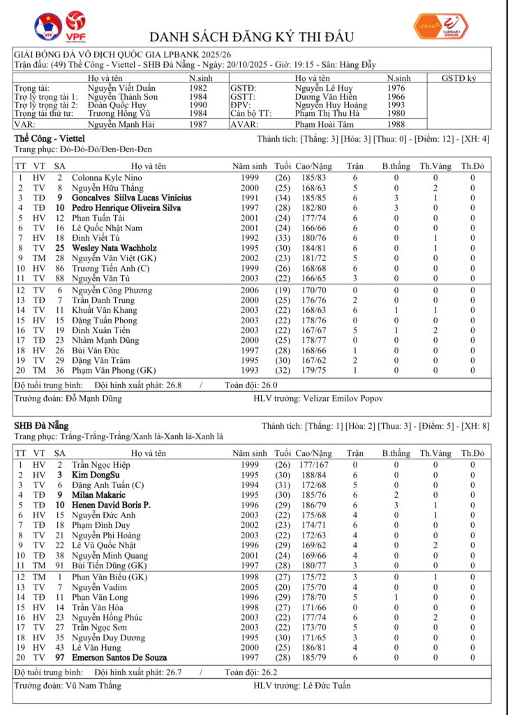Danh sách đăng ký thi đấu CLB Thể Công Viettel vs CLB SHB Đà Nẵng (vòng 7 Giải VĐQG LPBank 2025/26)