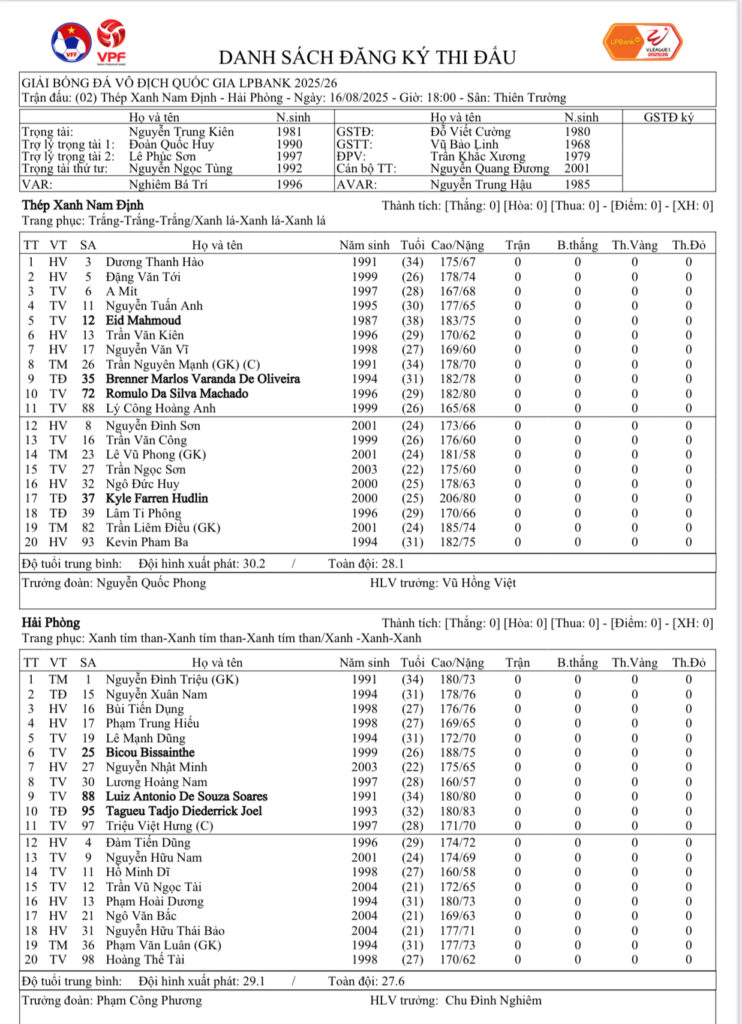 Danh sách đăng ký thi đấu CLB Thép Xanh Nam Định vs CLB Hải Phòng (vòng 1 LPBank V.League 1-2025/26)