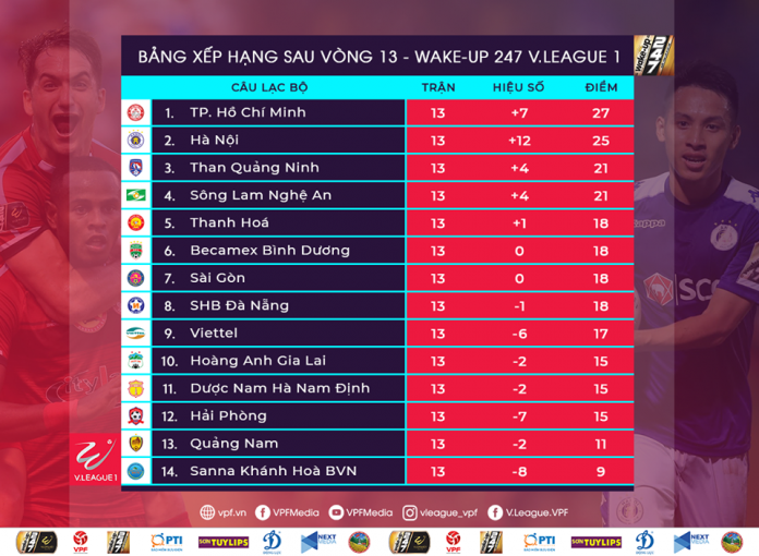 Trật tự bảng xếp hạng sau 13 vòng đấu cũng rất khó lường khi khoảng cách điểm số giữa các đội không quá cao. Khoảng cách 2 đội đầu bảng và 2 đội cuối bảng chỉ là 2 điểm. Thêm vào đó, top giữa bảng xếp hạng là những đội bóng cùng sở hữu 18 điểm như Thanh Hóa, Sài Gòn, B.Bình Dương, SHB Đà Nẵng. Việc các đội duy trì khoảng cách điểm số chắc chắn sẽ tạo nên những cuộc đua hấp dẫn tại giai đoạn lượt về của mùa giải.