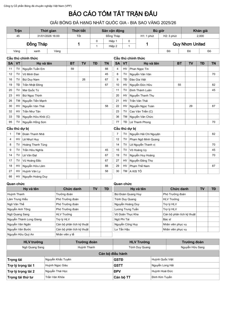 Báo cáo trận đấu CLB Đồng Tháp vs CLB Quy Nhơn United(vòng 8 HNQG Bia Sao Vàng 2025/26)
