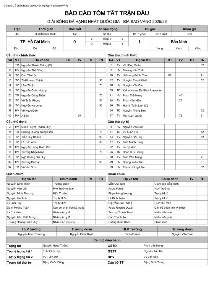 Báo cáo trận đấu CLB TP. Hồ Chí Minh vs CLB Bắc Ninh (vòng 8 HNQG 2025/26)