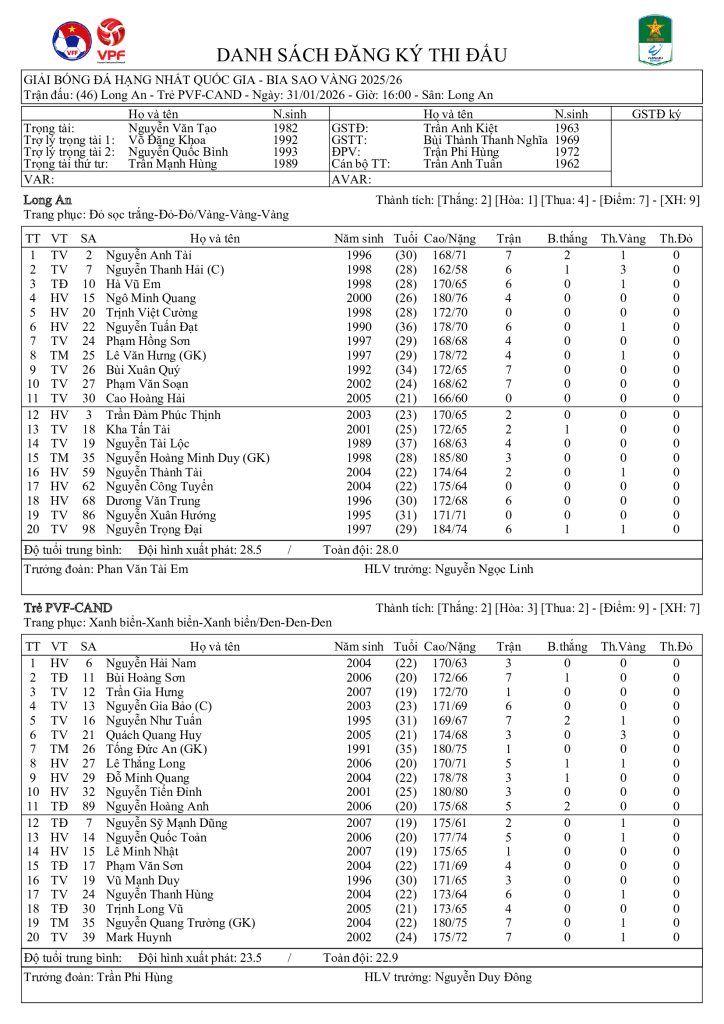 Danh sách đăng ký thi đấu CLB Long An vs CLB Trẻ PVF CAND (vòng 8 HNQG Bia Sao Vàng 2025/26)