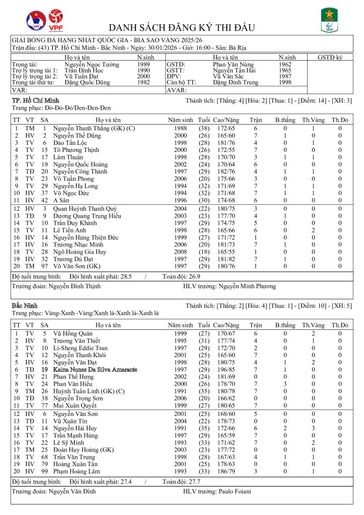 Danh sách đăng ký thi đấu CLB TP. Hồ Chí Minh vs CLB Bắc Ninh (vòng 8 HNQG Bia Sao Vàng 2025/26)