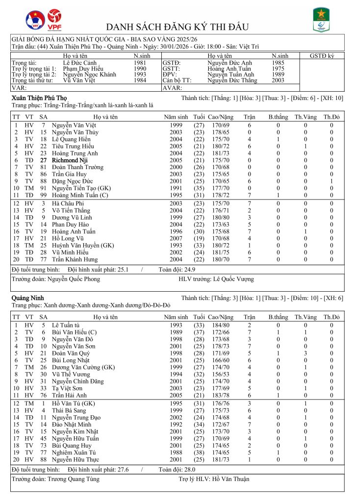 Danh sách đăng ký thi đấu CLB Xuân Thiện Phú Thọ vs CLB Quảng Ninh (vòng 8 HNQG Bia Sao Vàng 2025/26)