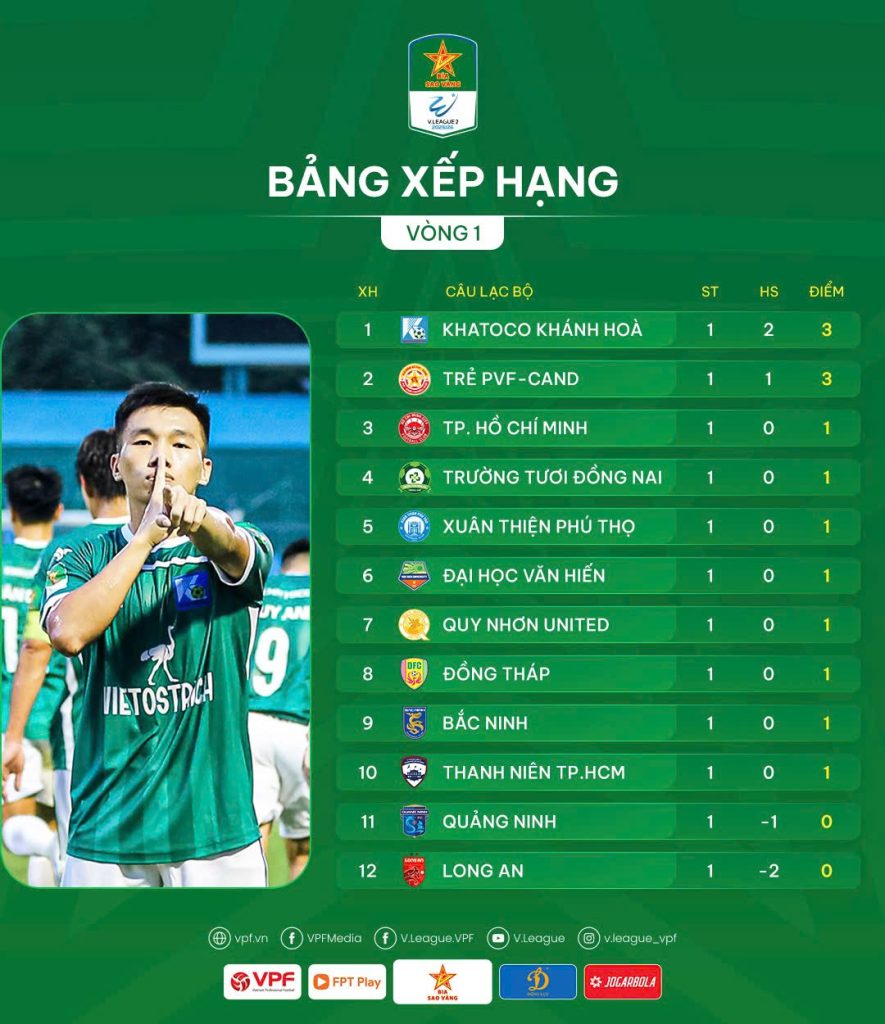 Những kết quả trên khiến chưa ứng viên nào có thể ngự trị đỉnh BXH sau vòng 1. Và hai cái tên xuất hiện trên đỉnh BXH là CLB Khatoco Khánh Hòa và Trẻ PVF-CAND. Đội bóng phố biển Nha Trang chiến thắng 2-0 trước CLB Long An và Trẻ PVF-CAND giành chiến thắng trước CLB Quảng Ninh. Đây là những kết quả khá bất ngờ ở loạt trận đầu tiên và mở ra những dự đoán về hành trình đầy hấp dẫn, thú vị phía trước khi các CLB đều ra sân với quyết tâm cao nhất, “biết mình biết người” để mang về số điểm tối đa.