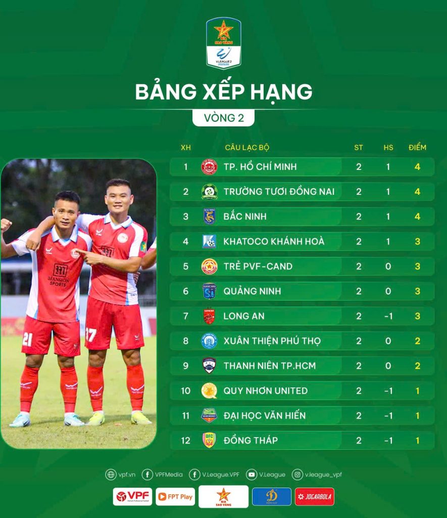 Tuy nhiên, đội bóng đang tạm dẫn đầu BXH sau vòng 2 lại là CLB TP.HCM. Giải mã thành công CLB Trẻ PVF-CAND, thầy trò HLV Minh Phương tạm dẫn đầu BXH với 4 điểm, bằng điểm với CLB Trường Tươi Đồng Nai và CLB Bắc Ninh. CLB TP.HCM là đội bóng gây ấn tượng ngay từ vòng đấu đầu tiên khi cầm hòa CLB Trường Tươi Đồng Nai 2-2 ngay tại sân vận động Bình Phước.