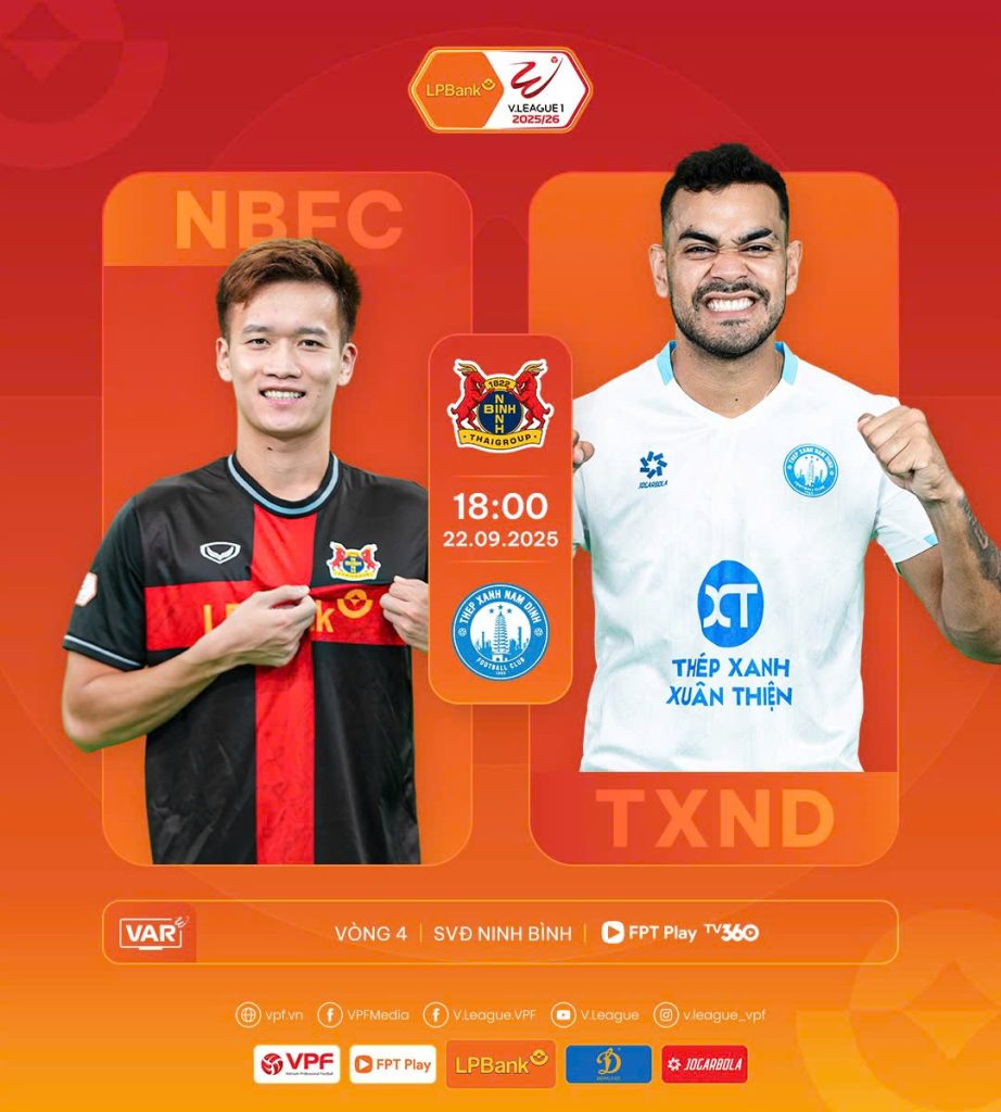 Trận đấu derby hấp hẫn thuộc vòng 4 LPBank V.League 1-2025/26 sẽ diễn ra chiều nay (22/9) giữa CLB Ninh Bình và CLB Thép Xanh Nam Định: