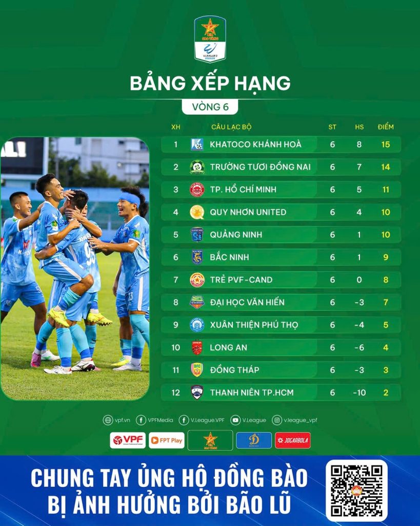Bảng xếp hạng sau vòng 6 Giải HNQG Bia Sao Vàng 2025/26: