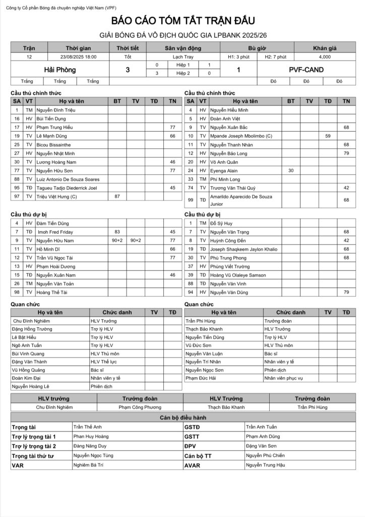 Báo cáo trận đấu CLB Hải Phòng vs CLB PVFCAND (vòng 2 LPBank V.League 1-2025/26)