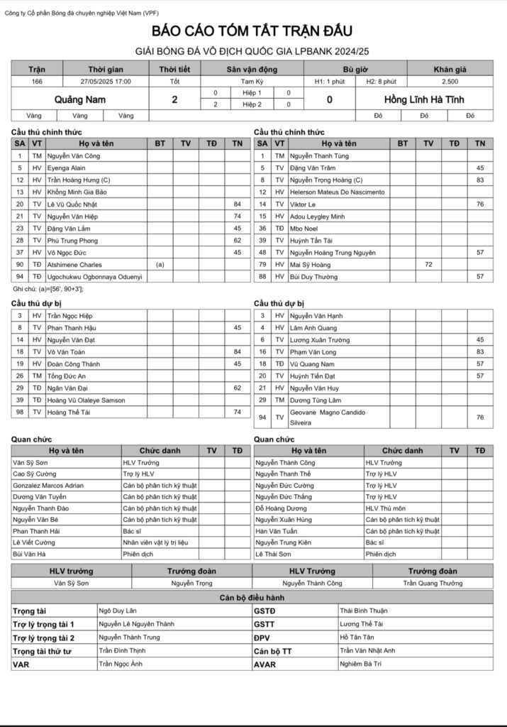 Báo cáo trận đấu CLB Quảng Nam vs CLB Hồng Lĩnh Hà Tĩnh (vòng 24 LPBank V.League 1-2024/25)