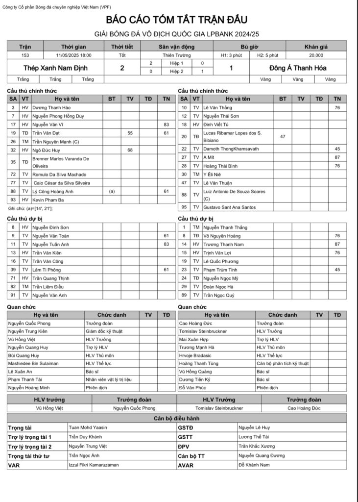 Báo cáo trận đấu CLB Thép Xanh Nam Định vs CLB Đông Á Thanh Hoá (vòng 22 VĐQG LPBank 2024/25)