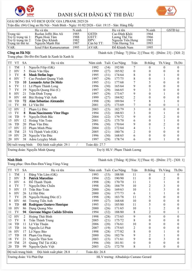 Danh sách đăng ký thi đấu CLB Công an Hà Nội và CLB Ninh Bình (vòng 12 Giải VĐQG LPBank 2025/26)