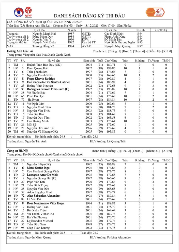 Danh sách đăng ký thi đấu CLB HAGL vs CLB Công an Hà Nội (bù vòng 4 VĐQG LPBank 2025/26)