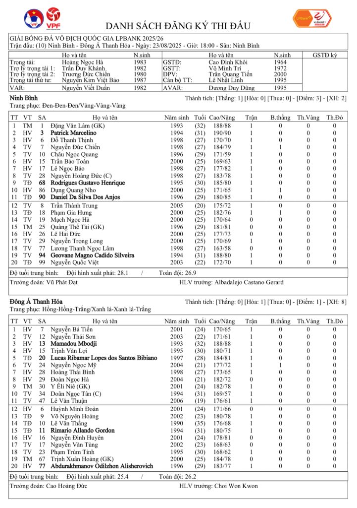 Danh sách đăng ký thi đấu CLB Ninh Bình vs CLB Đông Á Thanh Hoá (vòng 2 LPBank V.League 1-2025/26)