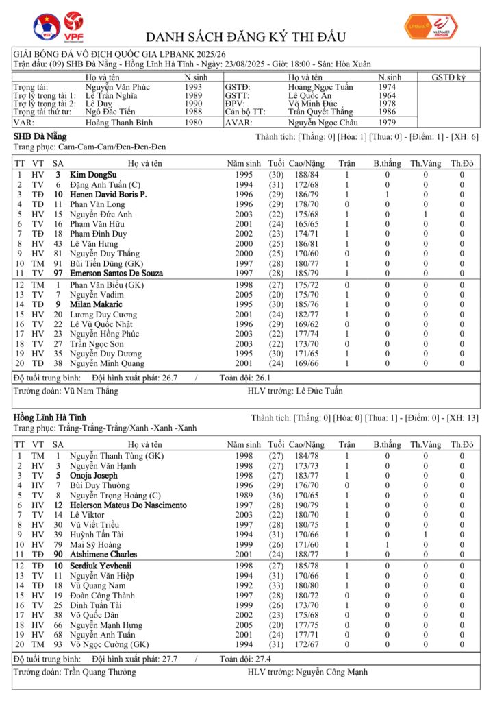 Danh sách đăng ký thi đấu CLB SHB Đà Nẵng vs CLB Hồng Lĩnh Hà Tĩnh (vòng 2 LPBank V.League 1-2025/26)