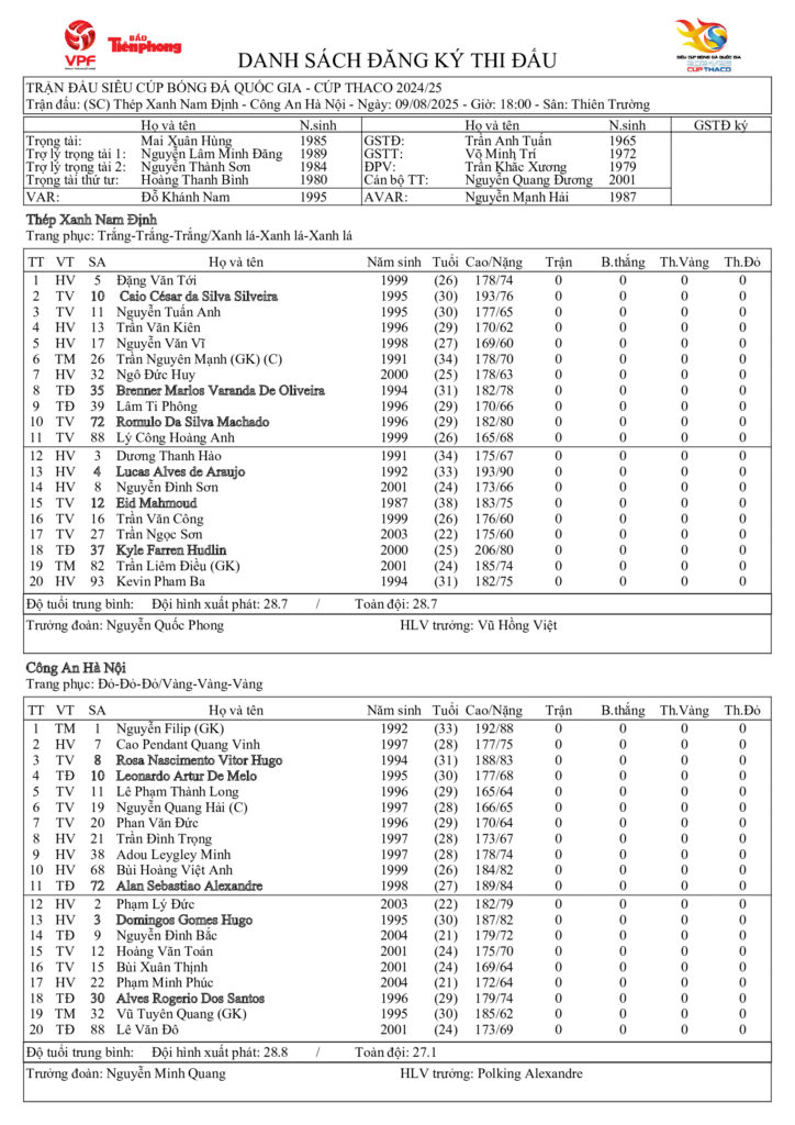 Danh sách đăng ký thi đấu CLB Thép Xanh Nam Định vs CLB Công An Hà Nội (Siêu cúp QG 2024/25)