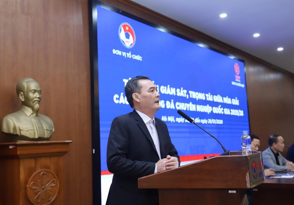 Thay mặt Thường trực BCH LĐBĐVN phát biểu chỉ đạo tại lễ khai mạc, ông Nguyễn Quốc Hội – Ủy viên Thường trực BCH LĐBĐVN nhấn mạnh, đây là hoạt động chuyên môn quan trọng được tổ chức vào thời điểm giữa mùa giải, nhằm tổng kết, đánh giá khách quan công tác giám sát và trọng tài ở giai đoạn lượt đi, đồng thời chuẩn bị tốt hơn cho giai đoạn lượt về, khi tính cạnh tranh, áp lực và yêu cầu chuyên môn được dự báo sẽ gia tăng. Ông Nguyễn Quốc Hội đề nghị toàn thể giám sát, trọng tài tham dự tập huấn phát huy tinh thần trách nhiệm, thẳng thắn trao đổi, tích cực tiếp thu, coi đây là dịp quan trọng để tự đánh giá, hoàn thiện bản thân. “LĐBĐVN luôn xác định công tác giám sát, trọng tài là yếu tố then chốt bảo đảm tính công bằng, minh bạch và uy tín của giải đấu. Mỗi quyết định, mỗi hành vi chuẩn mực của lực lượng giám sát, trọng tài đều có tác động trực tiếp đến niềm tin của các câu lạc bộ, cầu thủ và người hâm mộ,” ông Nguyễn Quốc Hội nhấn mạnh.