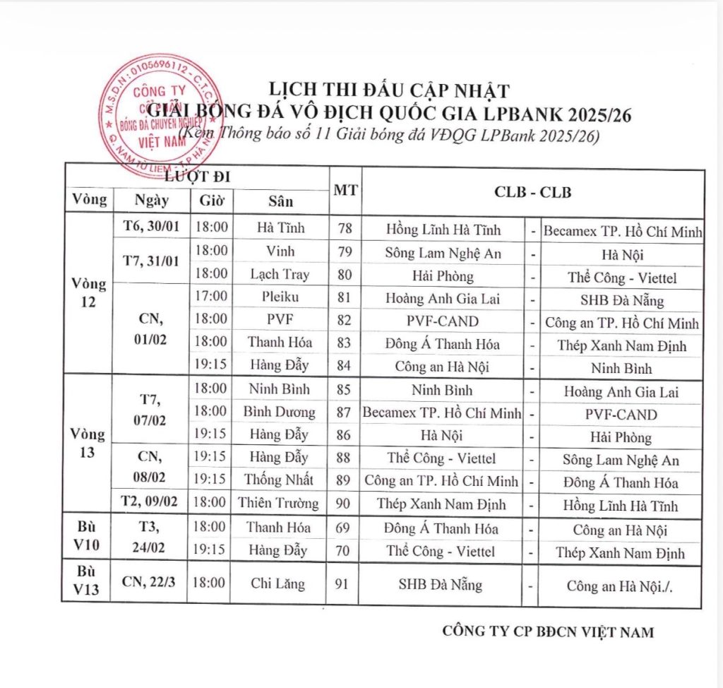 – Điều chỉnh lịch thi đấu trận đấu vòng 13 Giải bóng đá VĐQG LPBank 2025/26 giữa CLB SHB Đà Nẵng và CLB Công an Hà Nội trên SVĐ Chi Lăng từ ngày 09/02/2026 sang 18h00, ngày 22/3/2026.