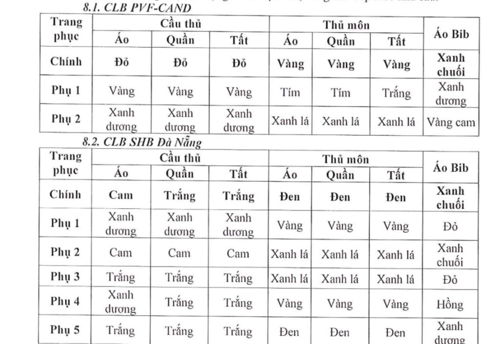 8. Về việc thay đổi, bổ sung trang phục thi đấu của CLB PVF-CAND, SHB Đà Nẵng