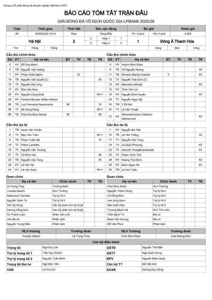 Báo cáo trận đấu CLB Hà Nội vs CLB Đông Á Thanh Hoá (vòng 5 VĐQG LPBank 2025/26)
