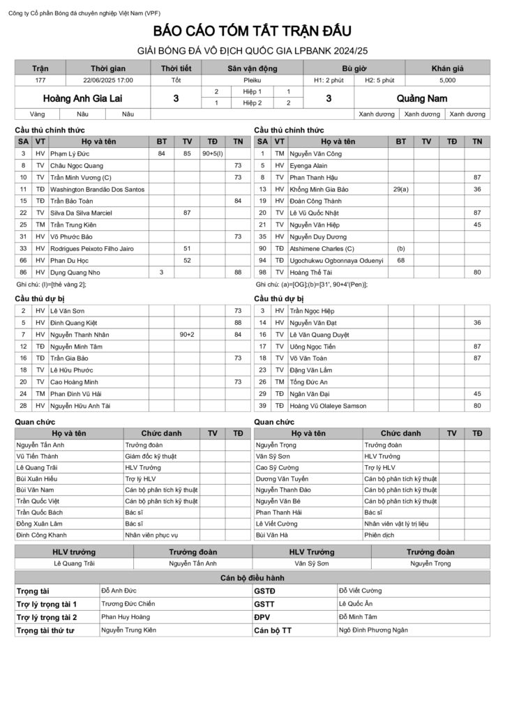 Báo cáo trận đấu CLB Hoàng Anh Gia Lai vs CLB Quảng Nam (vòng 26 VĐQG LPBank 2024/25)