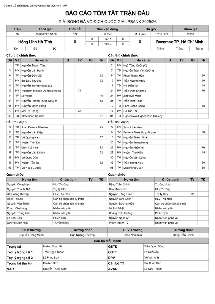 Báo cáo trận đấu CLB Hồng Lĩnh Hà Tĩnh vs CLB Becamex TP. Hồ Chí Minh