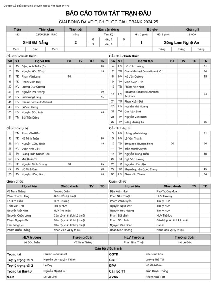 Báo cáo trận đấu CLB SHB Đà Nẵng vs CLB Sông Lam Nghệ An (vòng 26 VĐQG LPBank 2024/25)