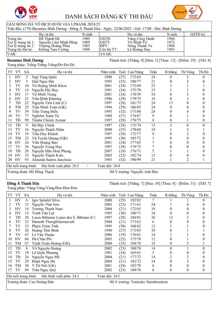 Danh sách đăng ký thi đấu CLB Becamex Bình Dương vs CLB Đông Á Thanh Hoá (vòng 26 VĐQG LPBank 2024/25)