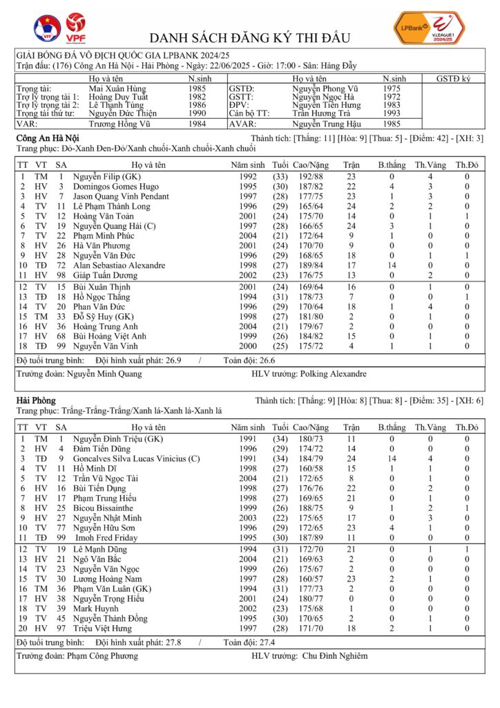 Danh sách đăng ký thi đấu CLB Công An Hà Nội vs CLB Hải Phòng (vòng 26 VĐQG LPBank 2024/25)